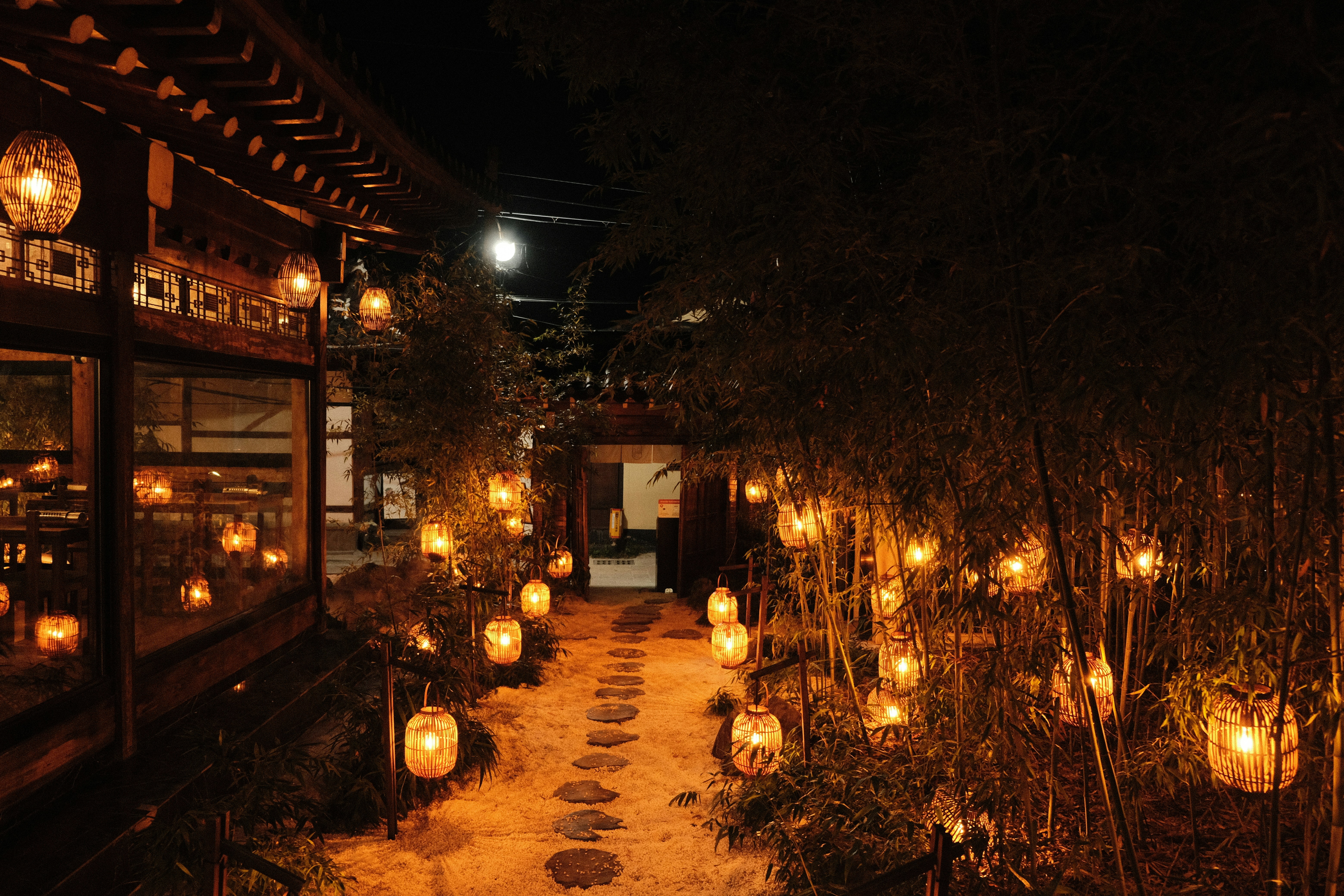 View of Donggung Palace and Wolji Pond illuminated by warm lights at sunset.